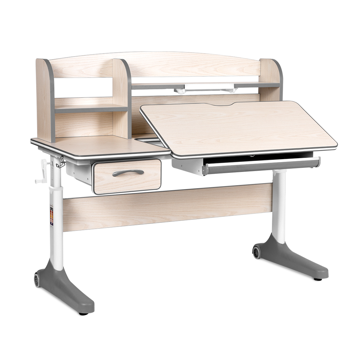 Растущая парта Anatomica Uniqa из натурального дерева - это отличный вариант парты для занятий в домашних условиях, ведь в ней есть все необходимое для хранения школьных принадлежностей: большой выдвижной ящик, пенал с раздельными органайзерами и надстройка с полками. Чтобы использовать рабочее место с максимальной пользой, вы можете хранить в выдвижном ящике тетради, небольшие учебники и личные вещи, в органайзер можно сложить все канцелярские принадлежности, которые необходимы быть под рукой, а надстройка станет идеальным местом для хранения книг. Столешница имеет антибликовое покрытие, которое снижает нагрузку на глаза ребенка и защищена от внешних повреждений. Угол наклона регулируется от 0 до 60 градусов и позволяет заниматься как письмом, чтением, так и рисованием, если перевести столешницу в режим мольберта. А регулировка высоты парты обеспечивает занятия не только сидя, но и стоя, что очень полезно для здоровья. Закругленные края парты продуманы с учетом техники безопасности и исключают возможные травмы. Ей не страшны и любые неровности пола, на этот случай есть регулируемые подпятники, с помощью которых можно нивелировать неровности. Для удобного перемещения парты по комнате на задней части ножек есть специальные большие колеса.